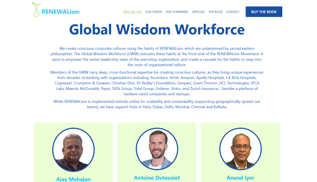 The Global Wisdom Workforce (GWW) is the executive arm of the RENEWALism Movement. Growing with every client engagement, the GWW serves as a handholder for senior leadership as they scale conscious culture online, across geographies. For details, please click the image below. The site opens in a new window.
